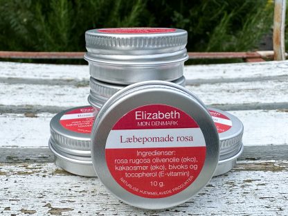 Ingredienser: rosa (rosa rugosa) udtræk i økologisk koldpresset olivenolie, økologisk kakaosmør (theobroma cacao), ren bivoks fra egne bistader og tocopherol (E-vitamin).